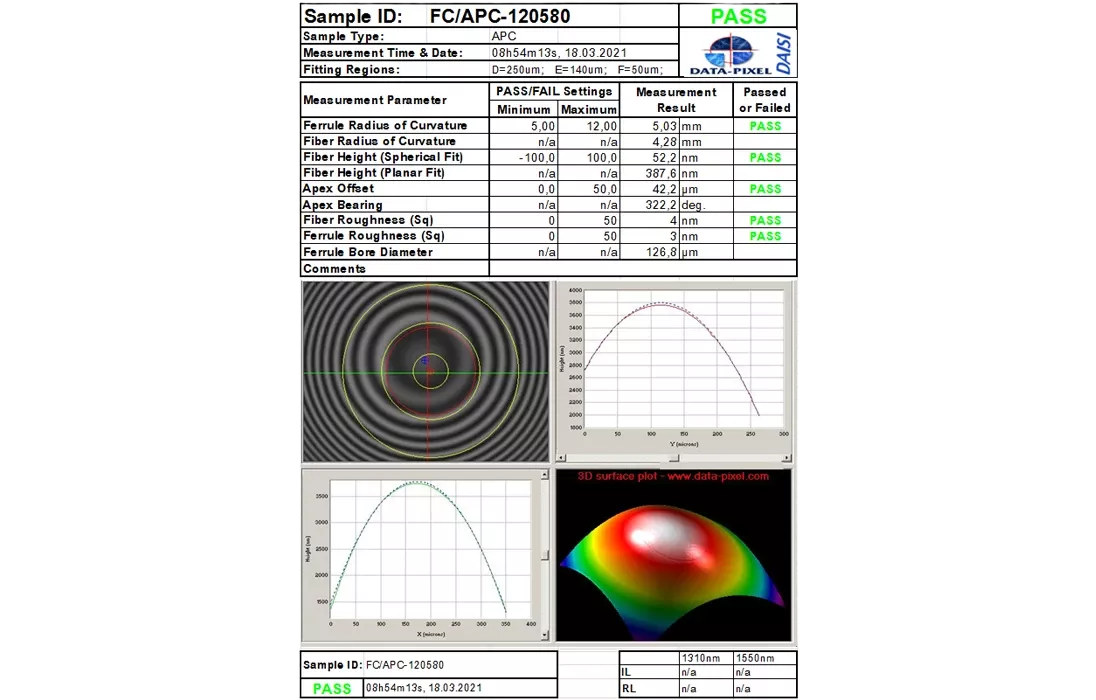 Высокое качество оптических шнуров серии ССД HS гарантируется 100% контролем качества оптических параметров шнуров. Типовое качество полировки торца ферулы приведено на фото с экрана интерферометра.