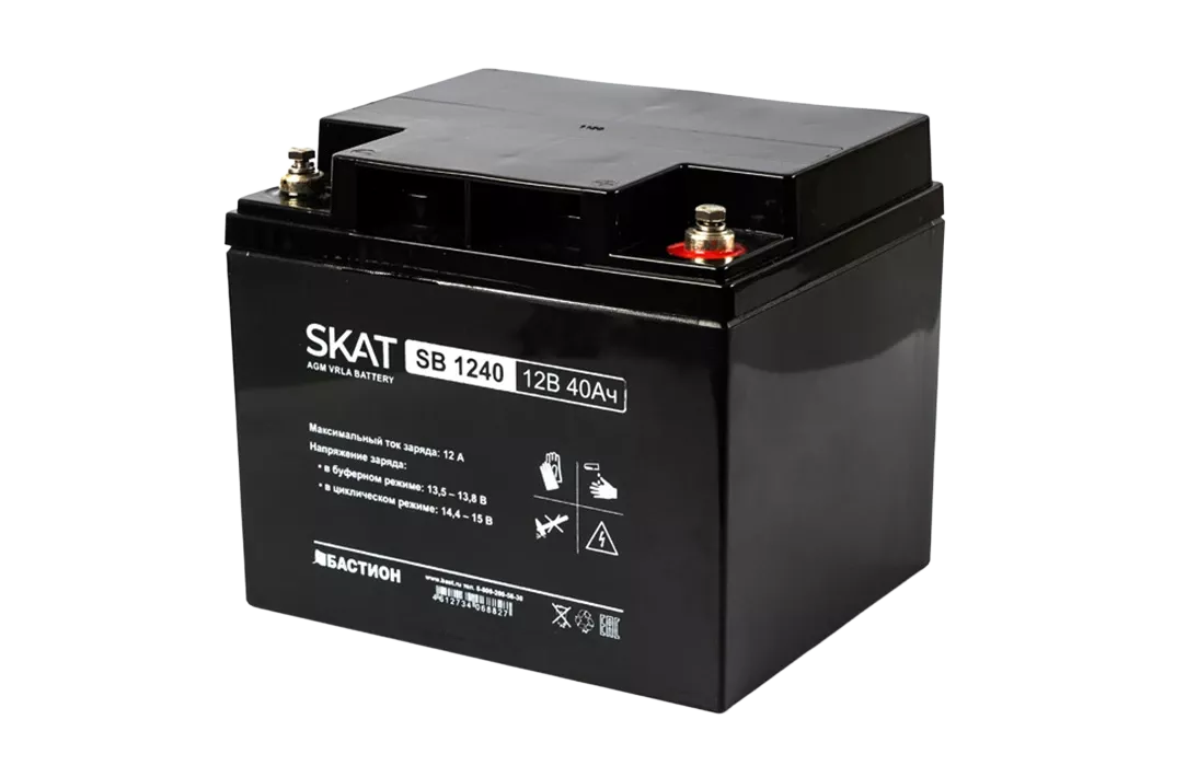 Аккумулятор герметичный свинцово-кислотный необслуживаемый SKAT SB 1240 производится по технологии AGM (Absorbent Glass Mat) с системой рекомбинации газов VLRA и предназначен для использования в составе системы резервного питания.