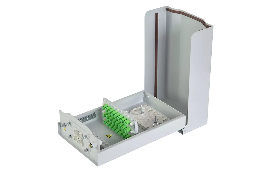 Корпус изготовлен из металла и окрашен порошковой краской. Внутри корпуса установлена кассета для сварки оптических волокон и адаптерные планки для размещения адаптеров SC типа.