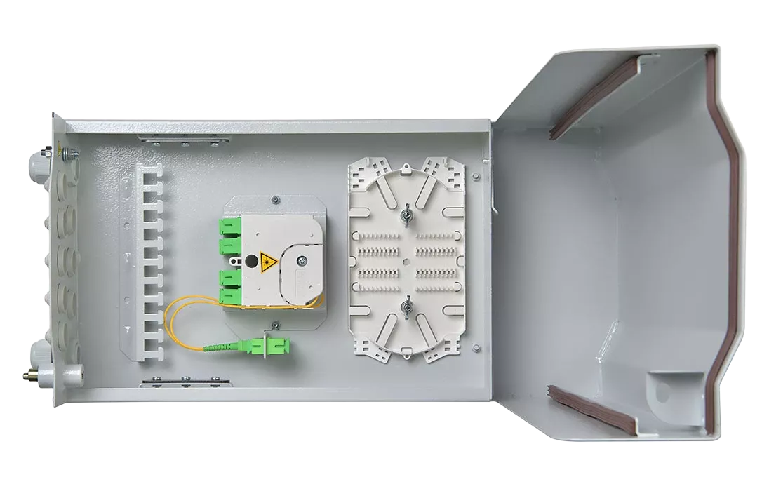 Корпус изготовлен из металла и окрашен порошковой краской. Внутри корпуса установлена кассета для сварки оптических волокон, адаптерная планка на две розетки SC типа для подключения входных разъемов сплиттерных модулей, а также панель для крепления универсальных сплиттерных модулей СМ3 (УСМ).