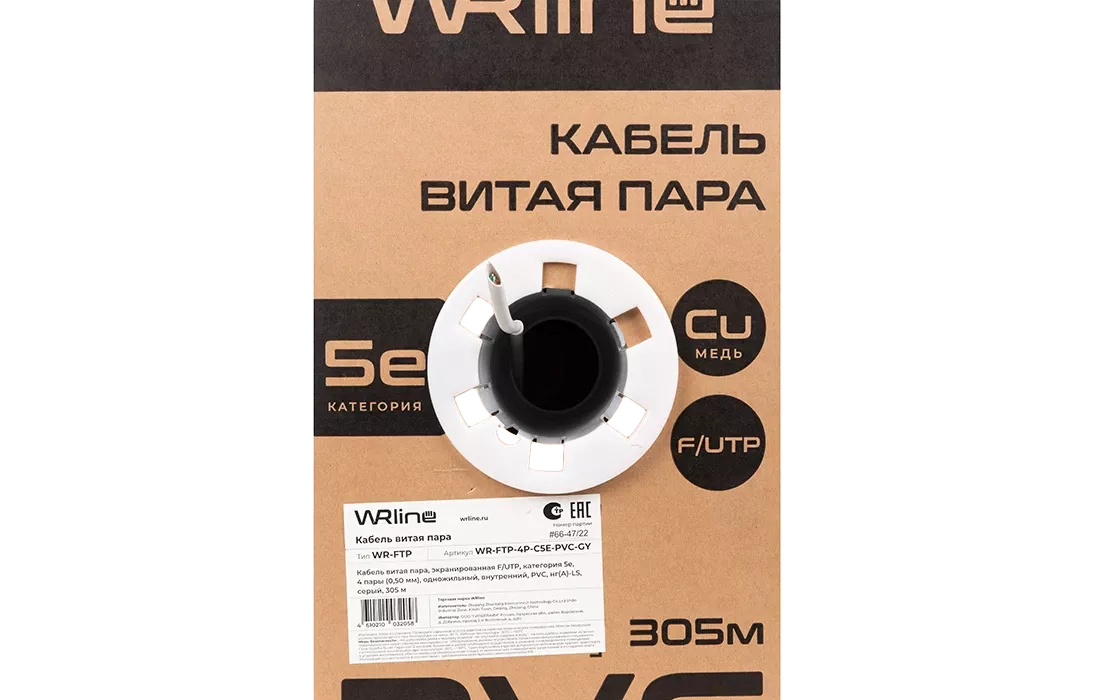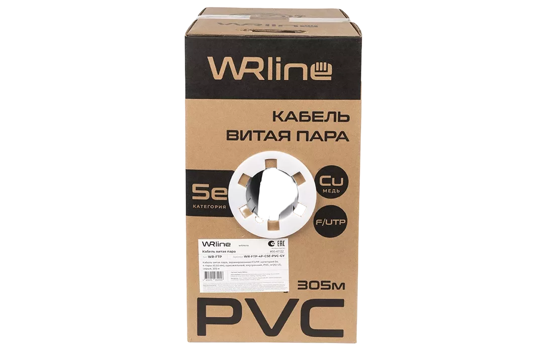 WRline WR-FTP-4P-C5E-PVC-GY Кабель витая пара, экранированный F/UTP, категория 5e, 4 пары (0,50 мм), одножильный, внутренний, PVC нг(А)-LS, серый, 305 м