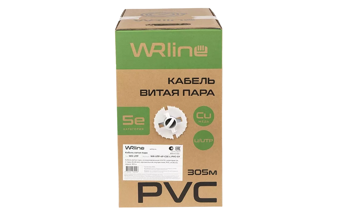 WRline WR-UTP-4P-C5E-L-PVC-GY Кабель витая пара, неэкранированный U/UTP, категория 5e, 4 пары (0,48 мм), одножильный, внутренний, PVC нг(А)-LS, серый, 305 м