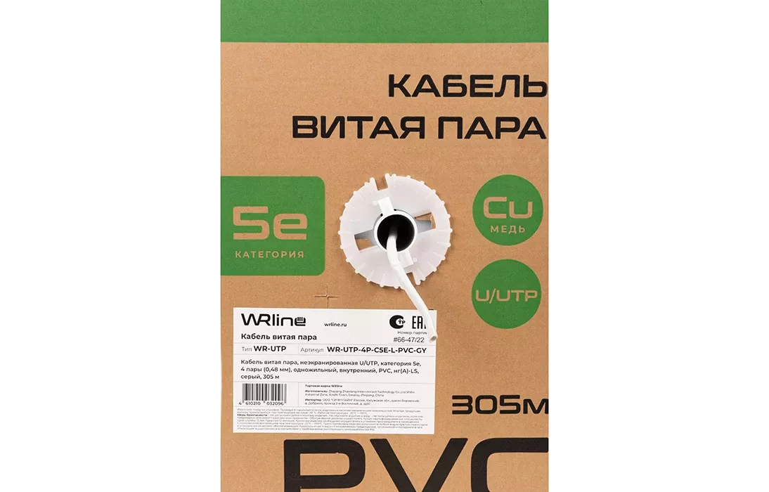 Четырехпарный кабель WRline категории 5е (серый) с проводником диаметром 0,48 мм предназначен для использования в системах передачи данных, в том числе структурированных кабельных сетях, информационной структуре предприятий, а также для конечного подключения клиентских устройств. Обеспечивает высокую скорость до 1 Гбит/c. Витые пары выполнены из качественной цельнотянутой меди, оболочка ПВХ в исполнении нг(А)-LS не распространяет горение и имеет пониженное дымовыделение.