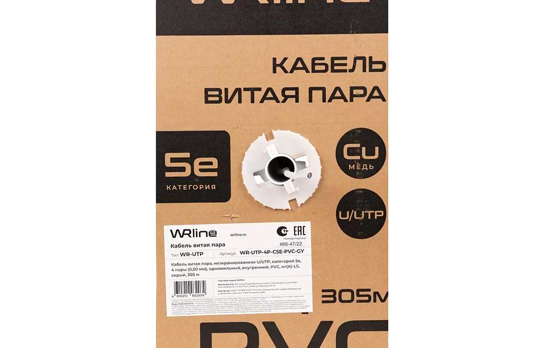 WRline WR-UTP-4P-C5E-PVC-GY Кабель витая пара, неэкранированный U/UTP, категория 5e, 4 пары (0,50 мм), одножильный, внутренний, PVC нг(А)-LS, серый, 305 м