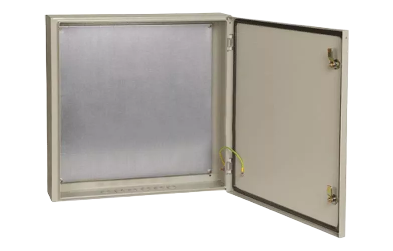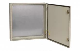 Сварной металлический корпус со съемной монтажной панелью. Дверца корпуса запирается на замок. Ключ замка имеет единый секрет. Корпуса со степенью защиты IP54, имеют на дверце уплотнение из двухкомпонентного герметика и пыле- влагонепроницаемый замок.