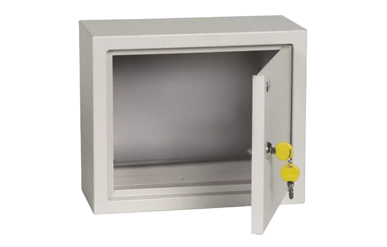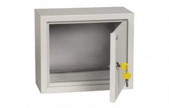 Сварной металлический корпус со съемной монтажной панелью. Дверца корпуса запирается на замок. Ключ замка имеет единый секрет. Корпуса со степенью защиты IP54, имеют на дверце уплотнение из двухкомпонентного герметика и пыле- влагонепроницаемый замок.
