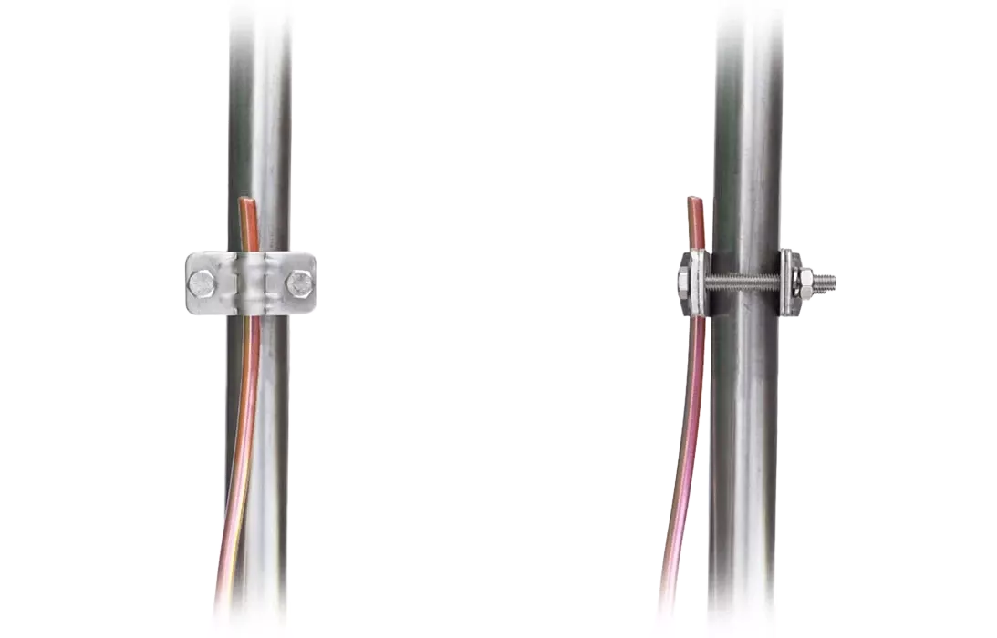 Зажим ZZ-202-002 позволяет подсоединить проволочный токоотвод диаметром 8 мм к молниеприёмникам стержневым ZZ-201-007-3, ZZ-201-008-3 и ZZ-201-010-3.