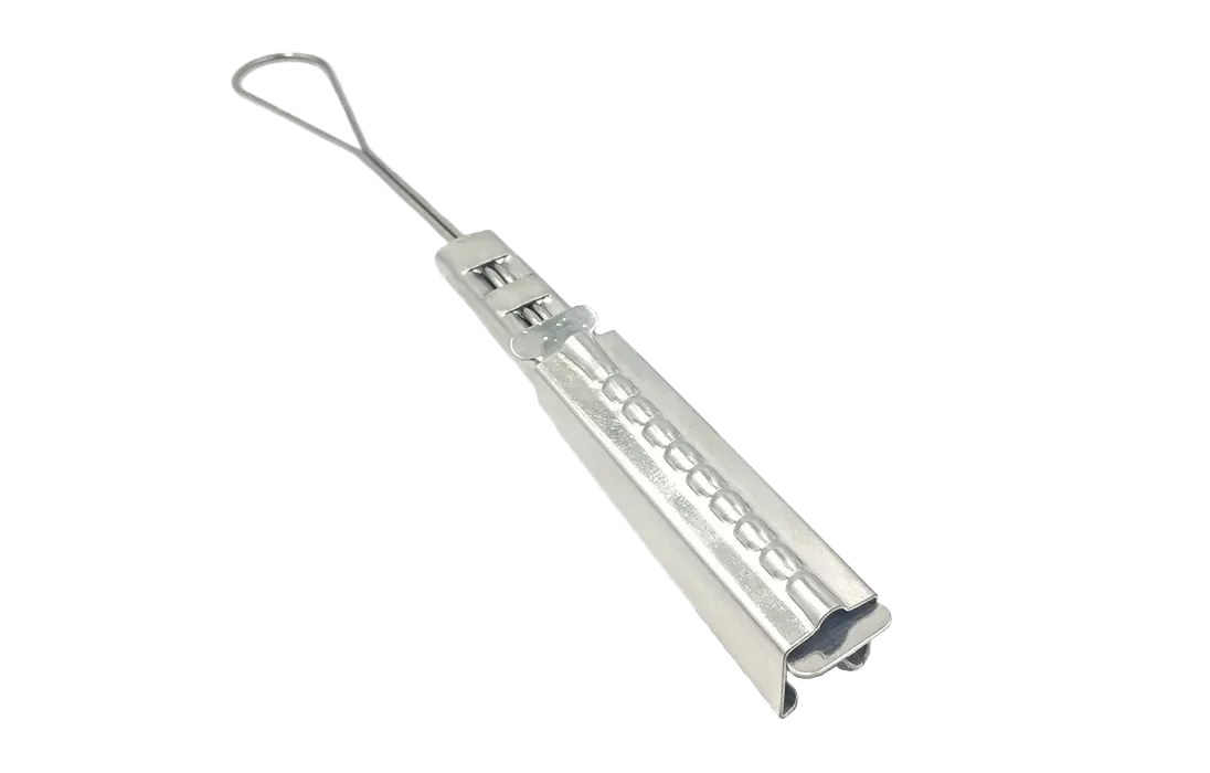 Зажимы изготавливаются из нержавеющей стали. Конструкция зажима исполнена из продольного ребристого корпуса, перфорированной вставки для лучшего сцепления с наружной оболочкой плоских и овальных кабелей и клинообразным стержнем с прикрепленной петлей для монтажа к кронштейнам и узлам.