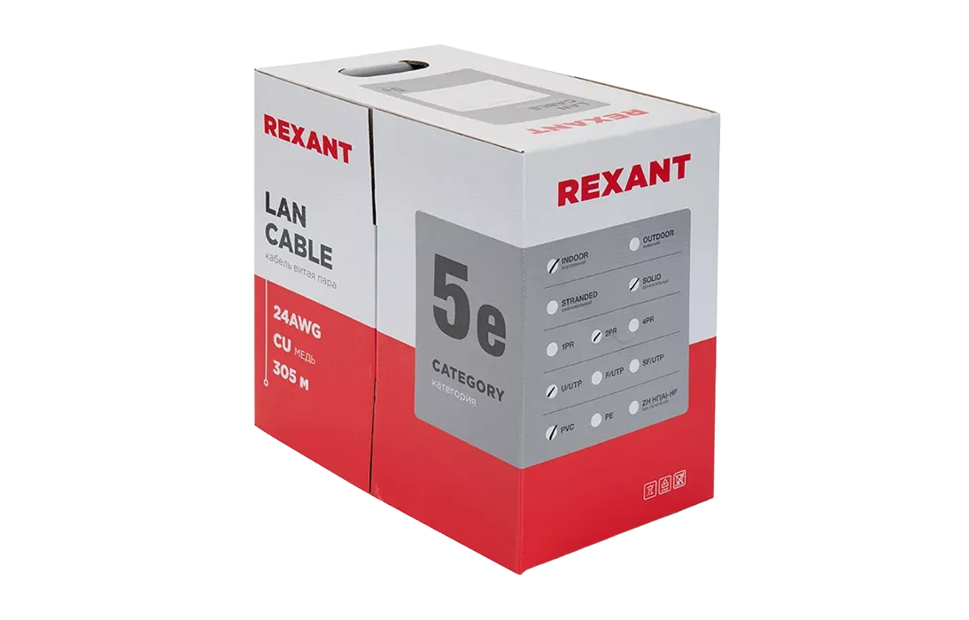 01-0023 Кабель витая пара REXANT UTP 2PR 24AWG, CAT5e, бухта 305 м, серый