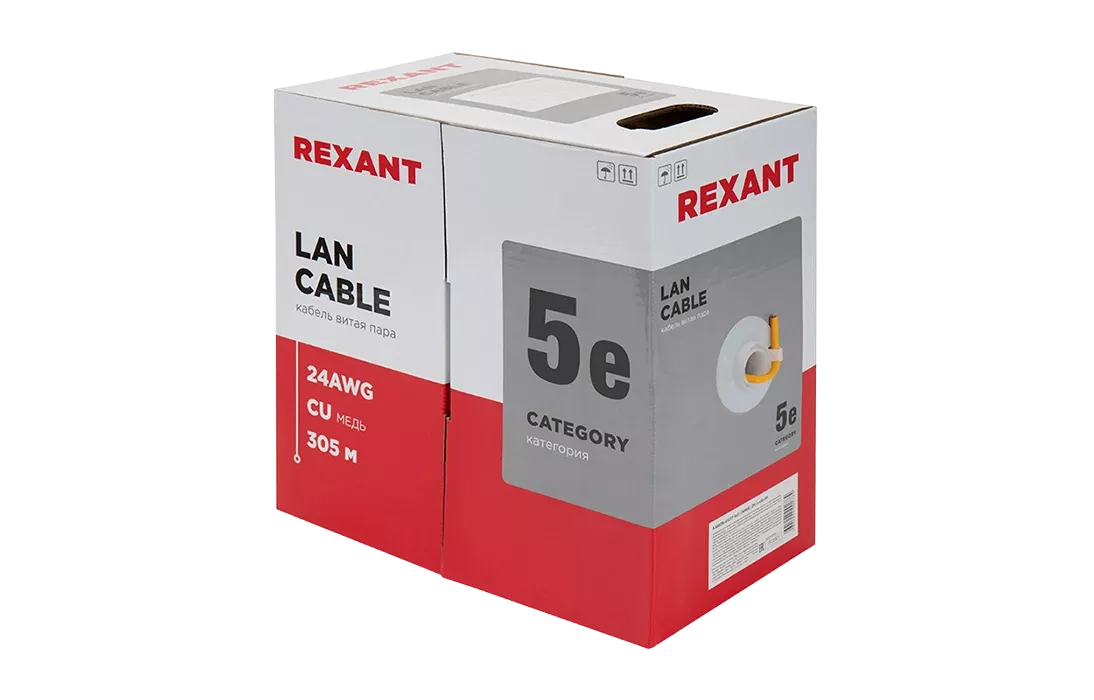 На кабеле нанесена маркировка с указанием категории кабеля, количества пар, типа и диаметра медного проводника. Кабель поставляется в картонных коробках на катушках по 305 метров.