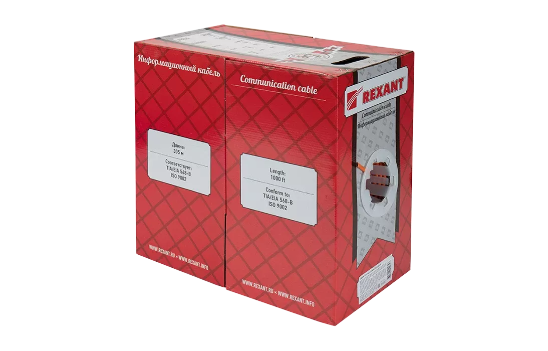 На кабеле нанесена маркировка с указанием категории кабеля, количества пар, типа и диаметра медного проводника. Кабель поставляется в картонных коробках на катушках по 305 метров.