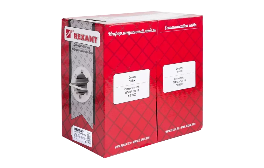 На кабеле нанесена маркировка с указанием категории кабеля, количества пар, типа и диаметра медного проводника. Кабель поставляется в картонных коробках на катушках по 305 метров.