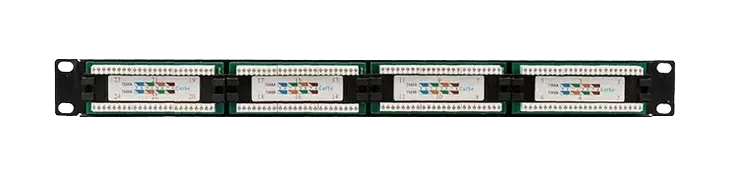 Представляет собой панель с множеством соединительных разъёмов – розеток RJ-45, расположенных на лицевой стороне панели и врезными контактами, расположенными на тыльной стороне панели, предназначенными для фиксированного соединения с витопарными кабелями.