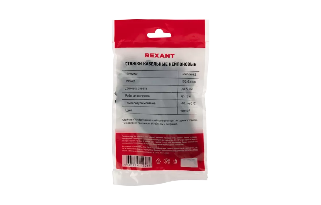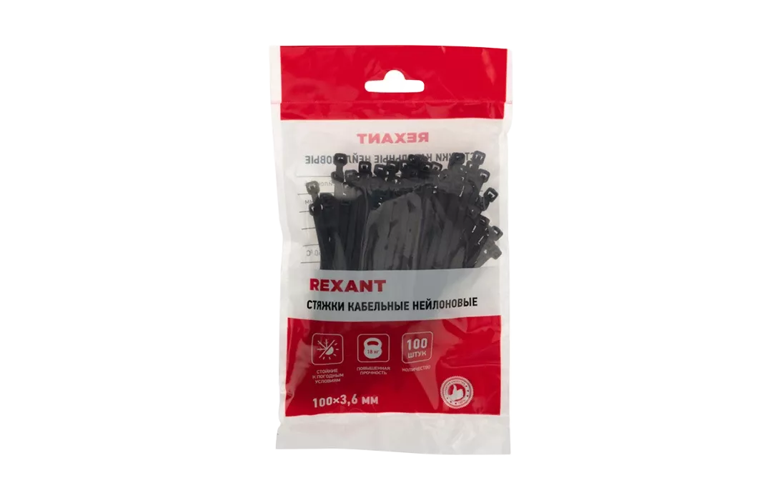 07-0101-4 Хомут-стяжка кабельная нейлоновая REXANT 100 x3,6 мм, черная, упаковка 100 шт.
