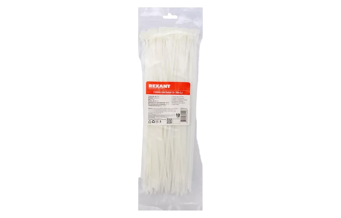 07-0300 Хомут-стяжка кабельная нейлоновая REXANT 300x3,6мм, белая, уаковка 100шт.