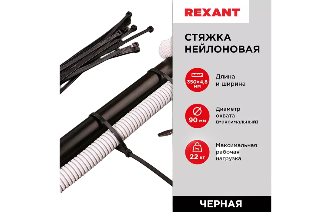 07-0351 Хомут-стяжка кабельная нейлоновая REXANT 350 x4,8 мм, черная, упаковка 100 шт.