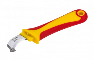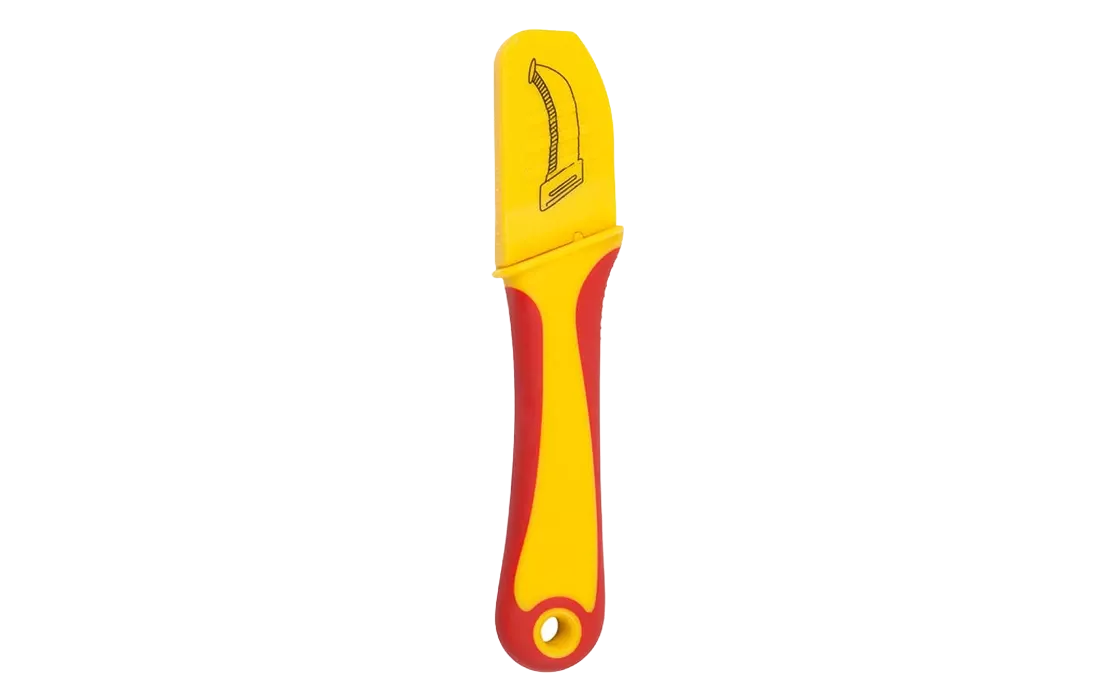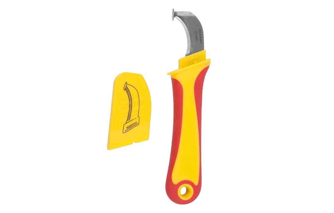 Нож монтажника предназначен для удаления изоляции с многожильного кабеля и других электромонтажных работ. Усиленное лезвие с прецизионной двухсторонней заточкой подходит для работы с толстыми материалами. Нож изготовлен из нержавеющей стали, благодаря чему защищен от коррозии и имеет продолжительный срок эксплуатации. Кончик ножа оснащен "пяткой" - ограничительной пластиной - для качественного снятия оболочки без риска повредить жильную изоляцию. Изогнутая форма лезвия делает нож удобным для работы в труднодоступных местах. Мощная противоскользящая двухкомпонентная рукоятка изготовлена из мягкого пластика и гарантирует комфорт и безопасность во время работы. Для удобного хранения и транспортировки ножа предусмотрены пластиковые ножны.