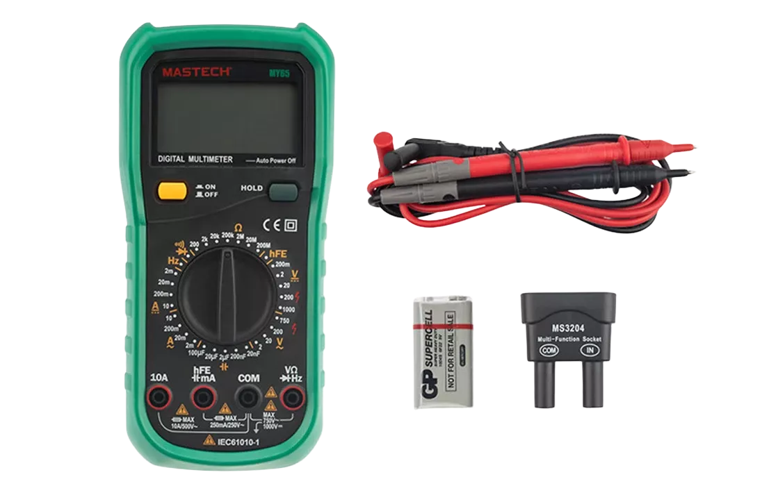 Мультиметр — электроизмерительный прибор, который включает в себя несколько функций и набор измеряемых параметров. Прибор MY65N относится к обновленной серии N, что отразилось на внешнем и внутреннем дизайне, ряде параметров и улучшенной схемотехнике, добавлена функция памяти данных на экране. Прибор измеряет постоянное и переменное напряжение, а также постоянный и переменный ток, сопротивление, емкость и частоту. С помощью данного прибора можно проводить тестирование диодов, прозвонку целостности цепи и измерение коэффициента усиления транзисторов. Таким образом, один прибор сможет заменить сразу несколько устройств одновременно.