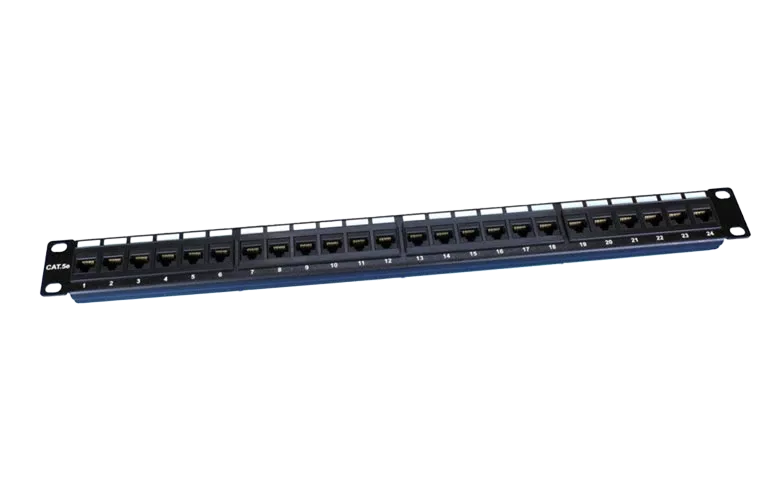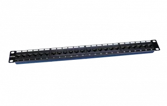 Представляет собой панель с множеством соединительных разъёмов – розеток RJ-45, расположенных на лицевой стороне панели и врезными контактами, расположенными на тыльной стороне панели, предназначенными для фиксированного соединения с витопарными кабелями.