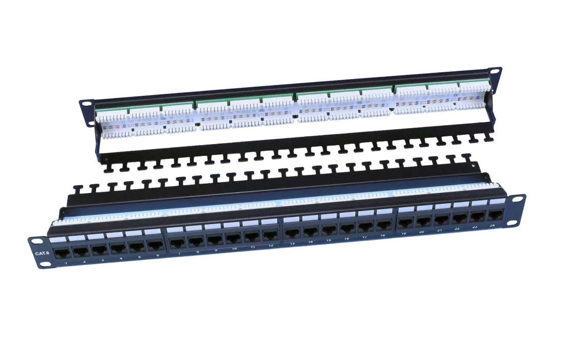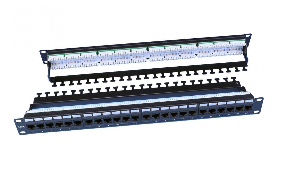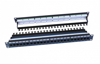 Представляет собой панель с множеством соединительных разъёмов – розеток RJ-45, расположенных на лицевой стороне панели и врезными контактами, расположенными на тыльной стороне панели, предназначенными для фиксированного соединения с витопарными кабелями.