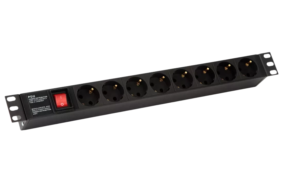 255002 Hyperline SHE19-8SH-S-IEC Блок розеток для 19" шкафов, горизонтальный, с выключателем с подсветкой, 8 розеток Schuko (10А), 250В, без кабеля пи