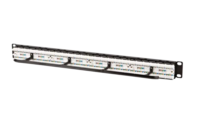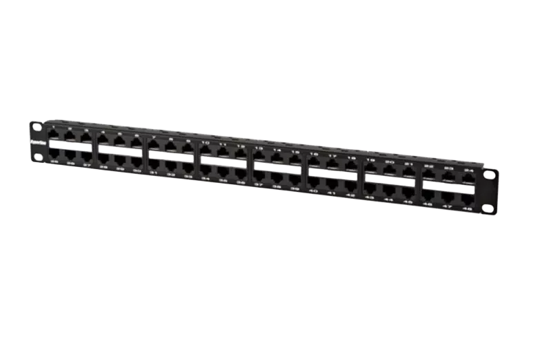 Представляет собой панель с множеством соединительных разъёмов – розеток RJ-45, расположенных на лицевой стороне панели и врезными контактами, расположенными на тыльной стороне панели, предназначенными для фиксированного соединения с витопарными кабелями.
