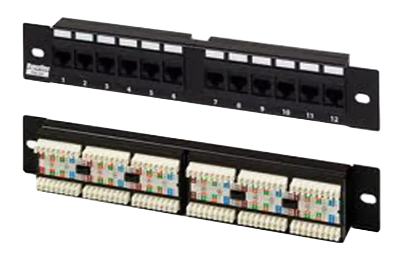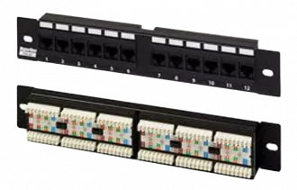 Представляет собой панель с множеством соединительных разъёмов – розеток RJ-45, расположенных на лицевой стороне панели и врезными контактами, расположенными на тыльной стороне панели, предназначенными для фиксированного соединения с витопарными кабелями.
