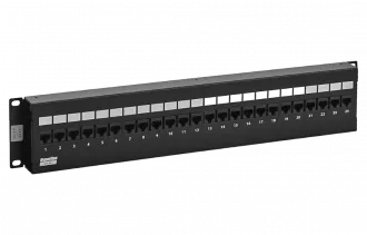 Представляет собой панель с множеством соединительных разъёмов – розеток RJ-45, расположенных на лицевой стороне панели и врезными контактами, расположенными на тыльной стороне панели, предназначенными для фиксированного соединения с витопарными кабелями.