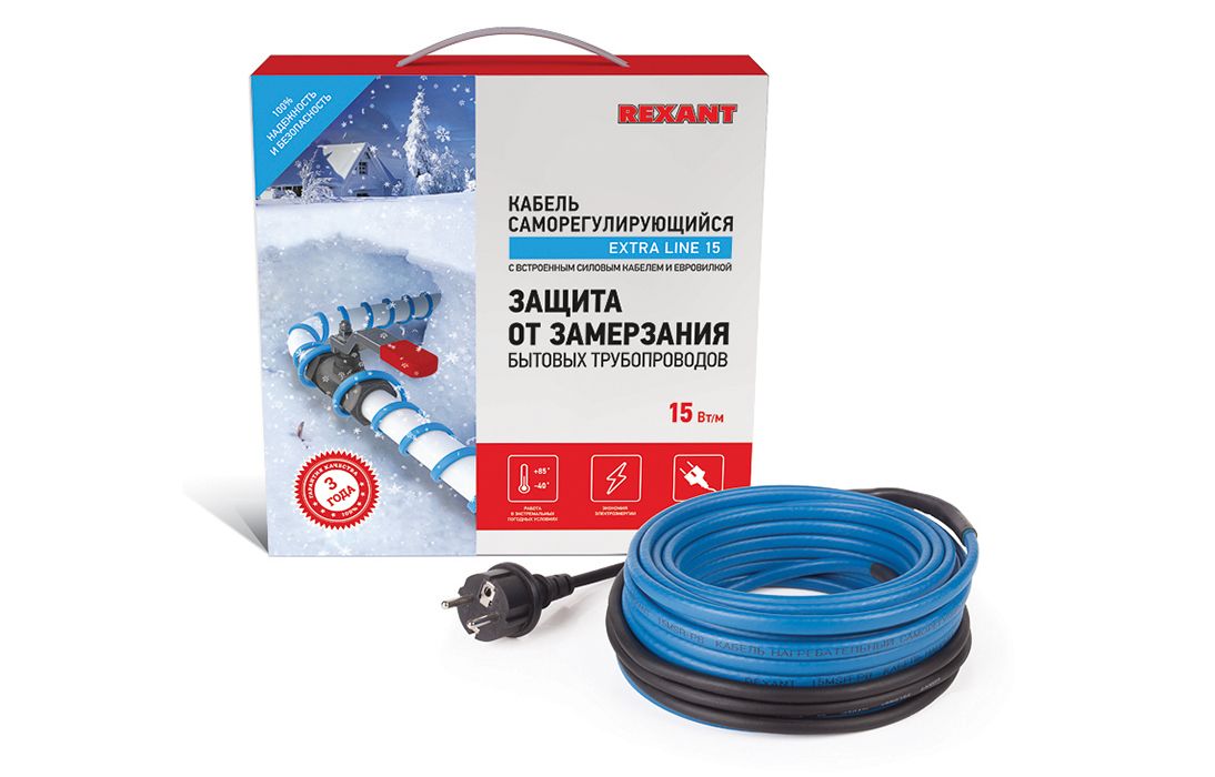 Комплект саморегулирующегося кабеля REXANT MSR-PB мощностью 15 Вт/м предназначен для профилактики замерзания бытовых трубопроводов, счетчиков воды, вентилей и т. п. Нагревательный кабель соединен с питающим кабелем, на конце которого находится евровилка для подключения в розетку с заземлением.