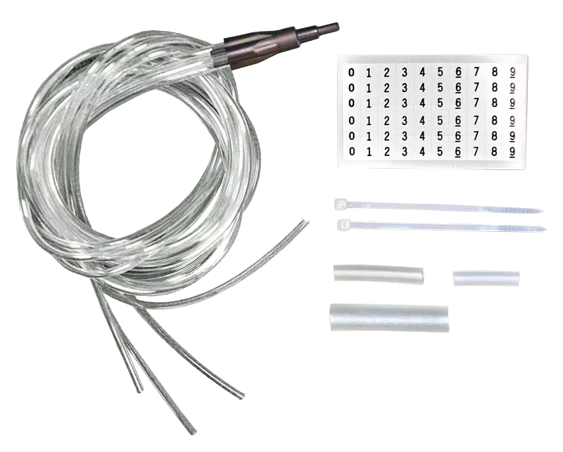 Комплект состоит из адаптера, набора переходных трубок и трубок для разветвления ОВ. Для маркировки трубок в комплект адаптера включены маркеры.