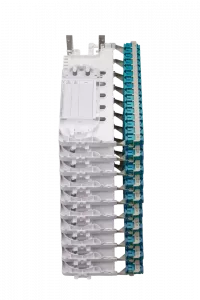 Конструктивной особенностью данного решения является монтаж и кросс-коммутация ОВ в откидных кроссовых модулях, объединенных в кроссовые блоки. Каждый модуль содержит кассету для укладки ОВ и панель с адаптерами (до 24 FC или 32 SC). В собранном состоянии модули размещаются в блоке вертикально, при этом адаптерные панели образуют кроссовое поле. При повороте модуля в горизонтальное положение обеспечивается удобный доступ к адаптерам и пигтейлам. Для монтажа модуль свободно снимается с блока за счет запаса длины транспортных трубок.