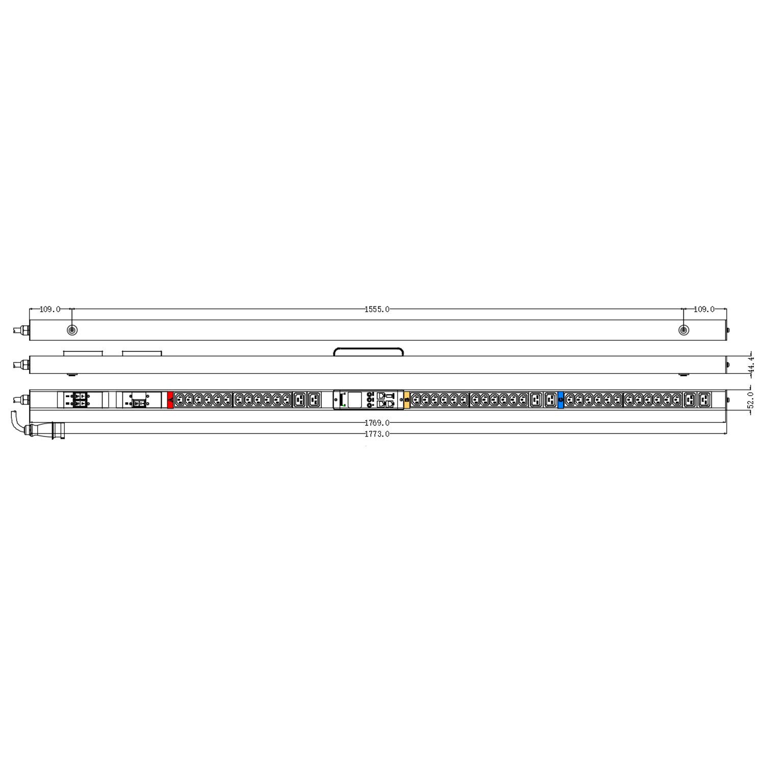 Блок распределения питания NTSS Metered, 3ф16А, 11кВт, 3 автоматических выключателя, (36)С13, (6)С19, 3м кабель с вилкой IEC 60309, 1769х52х44.4 мм