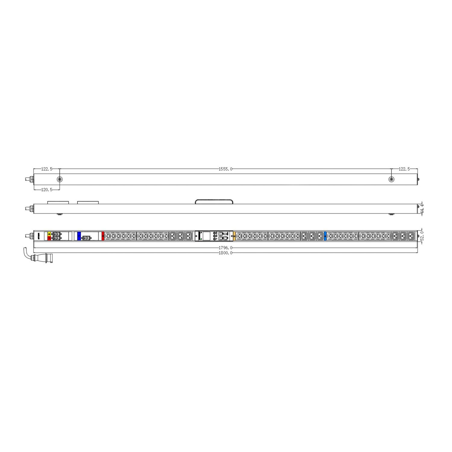 Блок распределения питания NTSS Metered, 3ф32А, 22кВт, 3 автоматических выключателей, (36)С13, (9)С19, 3м кабель с вилкой IEC 60309, 1712х52х50 мм