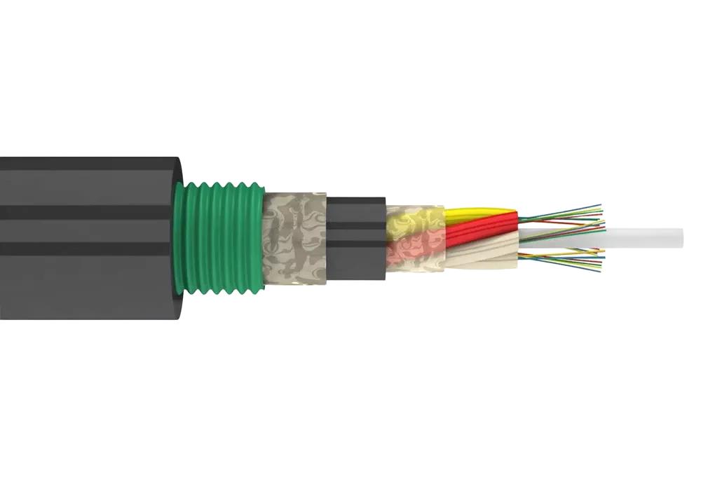 Повив оптических модулей вокруг стеклопластикового прутка защищен промежуточной полиэтиленовой оболочкой, стальной гофрированной лентой и наружной оболочкой из полимерного материала.