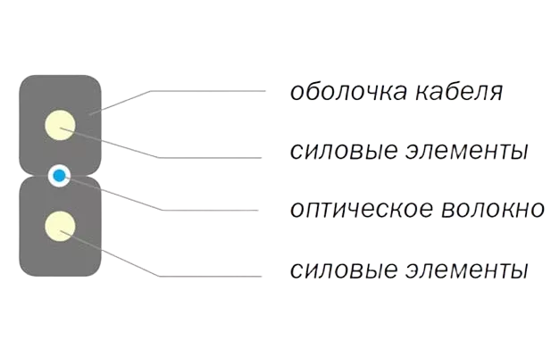 Кабель содержит одно оптическое волокно. Волокно и силовые элементы находятся в оболочке. Оболочка кабеля изготавливается из полимерной композиции, не распространяющей горение, не содержащей галогенов с низким дымовыделением. Оболочка кабеля изготавливается белым цветом. По согласованию с заказчиком цвет оболочки может быть изменен.