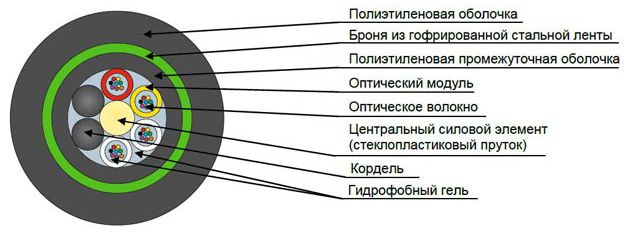 Конструктивно представляет собой повив оптических модулей вокруг стеклопластикового прутка, покрытый промежуточной полиэтиленовой оболочкой и защищенной стальной гофрированной лентой и наружной оболочкой из полиэтилена средней плотности. Свободное пространство в оптических модулях и в сердечнике кабеля заполнено гидрофобным гелем.