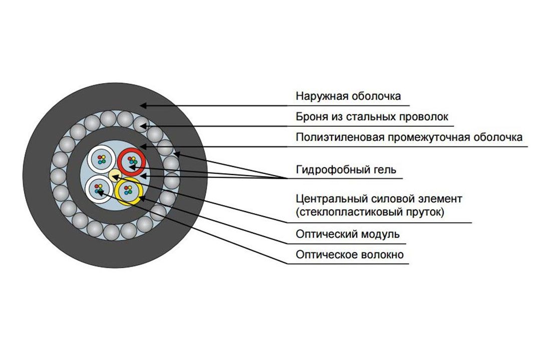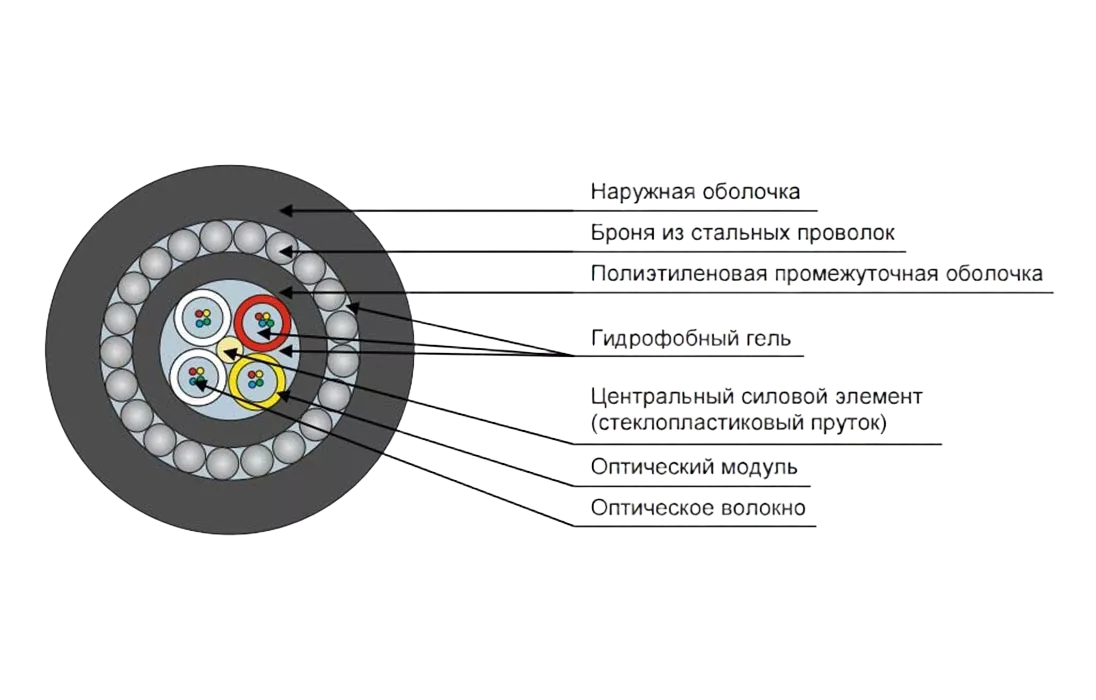 Конструктивно представляет собой повив оптических модулей вокруг стеклопластикового прутка, покрытый промежуточной полиэтиленовой оболочкой, броней из стальных оцинкованных проволок и наружной оболочкой из полиэтилена средней плотности. Свободное пространство в оптических модулях, в сердечнике кабеля, а также в бронепокрове заполнено гидрофобным гелем.
