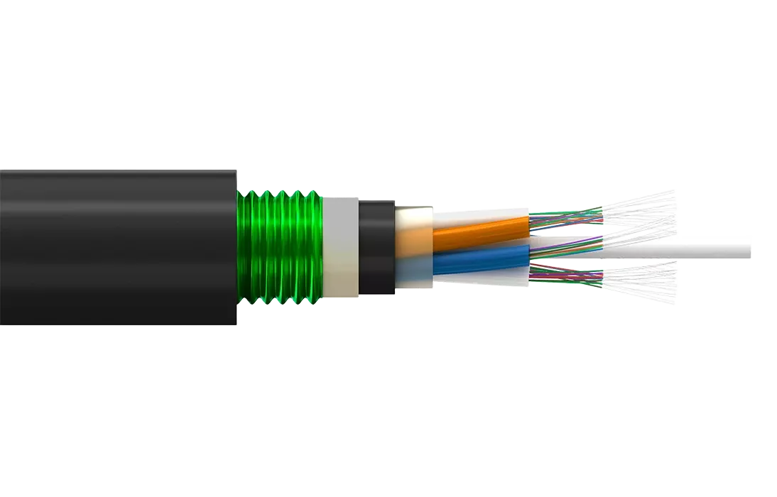 Кабель содержит сердечник модульной конструкции с центральным силовым элементом из диэлектрического стержня, вокруг которого скручены оптические модули со свободно уложенными волокнами. Свободное пространство в оптических модулях и в сердечнике кабеля заполнено гидрофобным гелем. На сердечник накладывается промежуточная оболочка из полиэтилена. На промежуточную оболочку продольно накладывается броня из гофрированной стальной ленты. Свободное пространство между промежуточной оболочкой и броней заполнено гидрофобным гелем. На броню накладывается оболочка из полиэтилена средней плотности.
