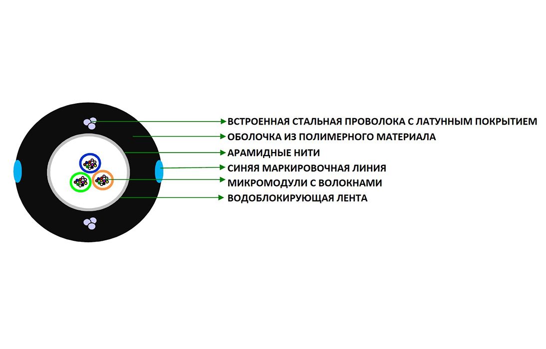 Конструкция содержит пучок многоволоконных микромодулей, на который наложен слой упрочняющих арамидных нитей. В оболочке кабеля диаметрально противоположно расположены две стальные проволоки с латунным покрытием, на внешней стороне оболочки имеется синяя маркировочная линия.