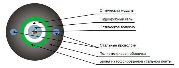 Конструктивно представляет собой центральный оптический модуль, защищенный стальной гофрированной лентой и наружной оболочкой из полиэтилена средней плотности, в которую встроены силовые элементы из стальных проволок. Свободное пространство в оптическом модуле и под гофрированной лентой заполнено гидрофобным гелем.