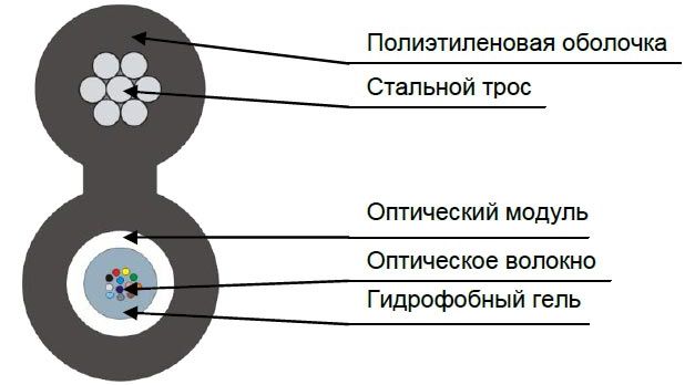 Центральный оптический модуль защищен наружной оболочкой из полимерного материала. Кабель имеет выносной силовой элемент, выполненный из стального троса покрытого полимерной оболочкой.
