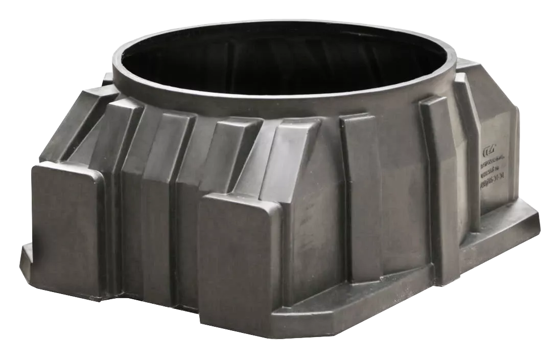 Камера имеет в сечении форму обратного конуса и состоит из двух цельнолитых элементов – крышки и корпуса. Такая форма препятствует выталкиванию устройства из грунта при его выпучивании или подвижке. На каждом из четырех углов корпуса находится по одной плоской присоединительной площадке, через которые можно ввести трубы диаметром до 125 мм.