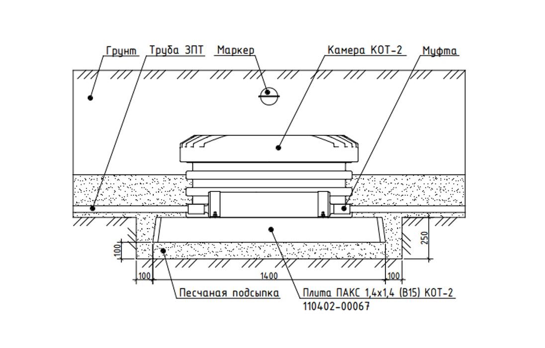 Камера КОТ-2 предназначена для строительства электрических и телекоммуникационных магистральных кабельных сетей в качестве необслуживаемого смотрового устройства кабельной канализации, для защиты муфт и технологического запаса кабеля от внешних воздействий (включая грызунов) в местах стыковки рабочих длин кабеля, проложенного в полиэтиленовых трубах. Устанавливается на участках загородных кабельных трасс, а также в местах отсутствия постоянного движения транспорта, в качестве проходного, углового или разветвительного смотрового устройства.