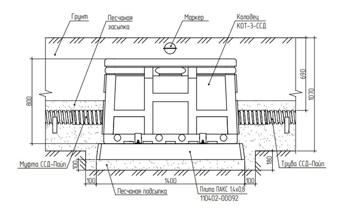 Предназначена для строительства электрических и телекоммуникационных магистральных кабельных сетей в качестве необслуживаемого смотрового устройства кабельной канализации, для защиты муфт и технологического запаса кабеля от внешних воздействий (включая грызунов) в местах стыковки рабочих длин кабеля, проложенного в полиэтиленовых трубах. Устанавливается на участках загородных кабельных трасс, а также в местах отсутствия постоянного движения транспорта, в качестве проходного, углового или разветвительного смотрового устройства.
