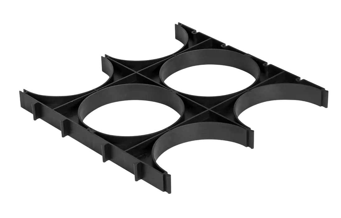 Кластер представляет собой решетчатое изделие с ложементами для укладки труб, выполненное из пластика. На корпусе кластера имеются специальные выступы и пазы для соединения нескольких кластеров в единый блок при прокладке большего количества каналов.