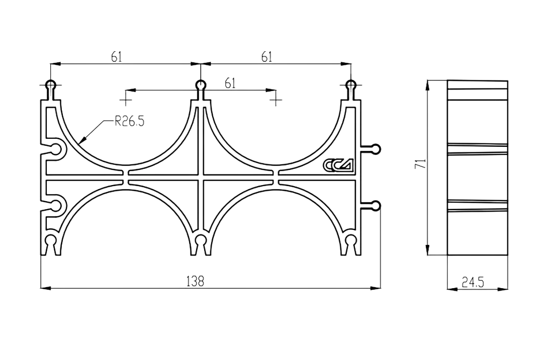 Кластер представляет собой решетчатое изделие с ложементами для укладки труб, выполненное из пластика. На корпусе кластера имеются специальные выступы и пазы для соединения нескольких кластеров в единый блок при прокладке большего количества каналов.