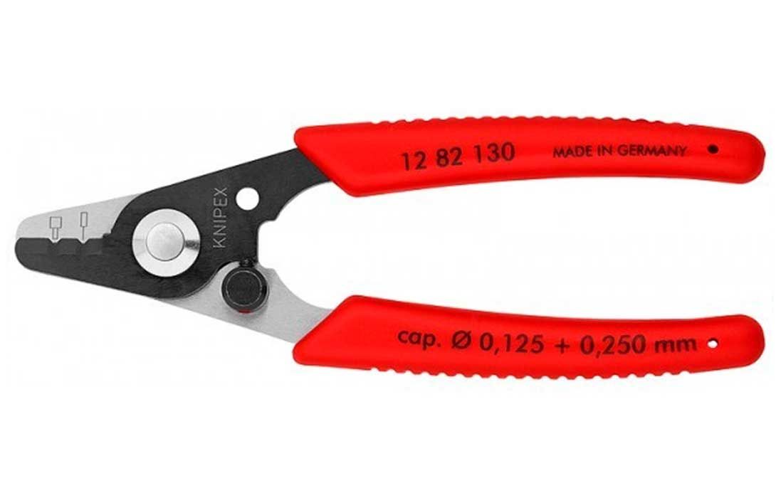 KN-1282130SB Стриппер Knipex для снятия изоляции с оптического волокна. Для удаления первичной и вторичной оболочки с оптоволоконных кабелей. Хромованадиевая электросталь особого качества, закалённая в масле.