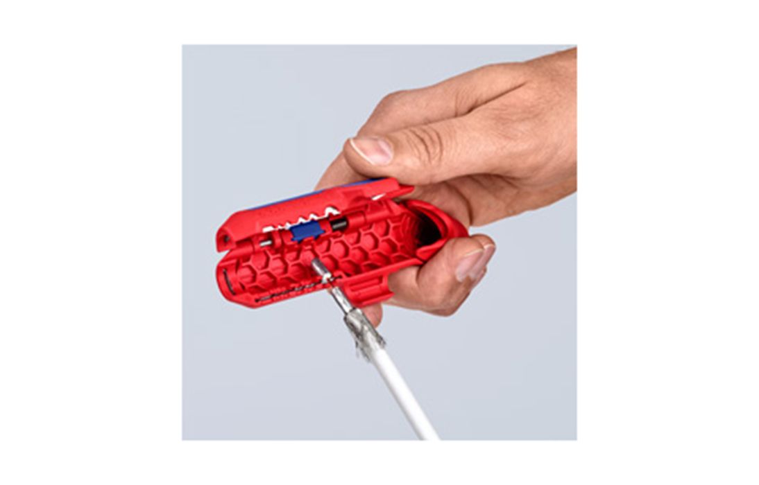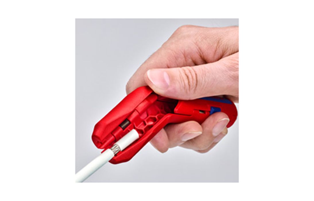 16 95 01 SB KNIPEX ErgoStrip® Для быстрого и точного удаления изоляции с наиболее часто применяемых круглых проводов и проводов для сырых помещений (например, NYM от 3 x 1,5 мм² до 5 x 2,5 мм²), дата-кабеля (витой пары) и коаксиального кабеля. Инновационный, эргономичный дизайн ручки пистолетной формы для лёгкого снятия и продольного реза изоляции. Оформленный конусом край инструмента для лучшего доступа к проводам в узком пространстве. Возможность удаления изоляции сечений 0,2 / 0,3 / 0,8 / 1,5 / 2,5 / 4 мм². Легкий ввод провода для удаления изоляции благодаря направляющим буртикам. С раскрывающей пружиной и замком. Удобная укладка коаксиального и дата-кабеля благодаря конструкции инструмента. Многокомпонентные рукоятки с зоной из мягкого пластика для удобной работы и надежного хвата.