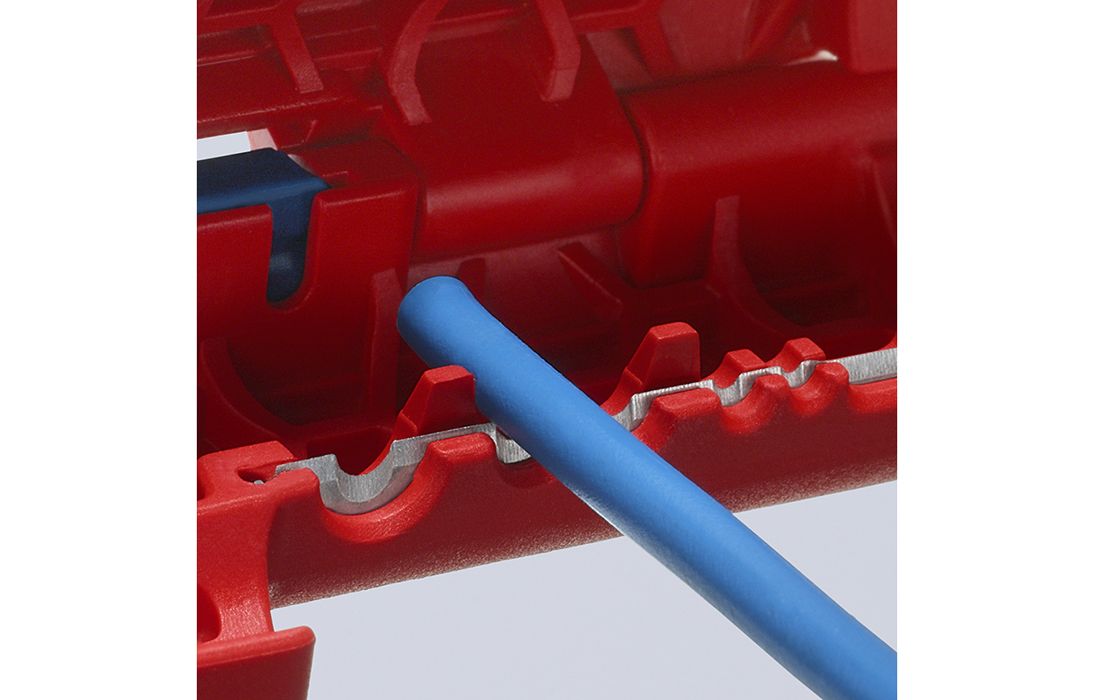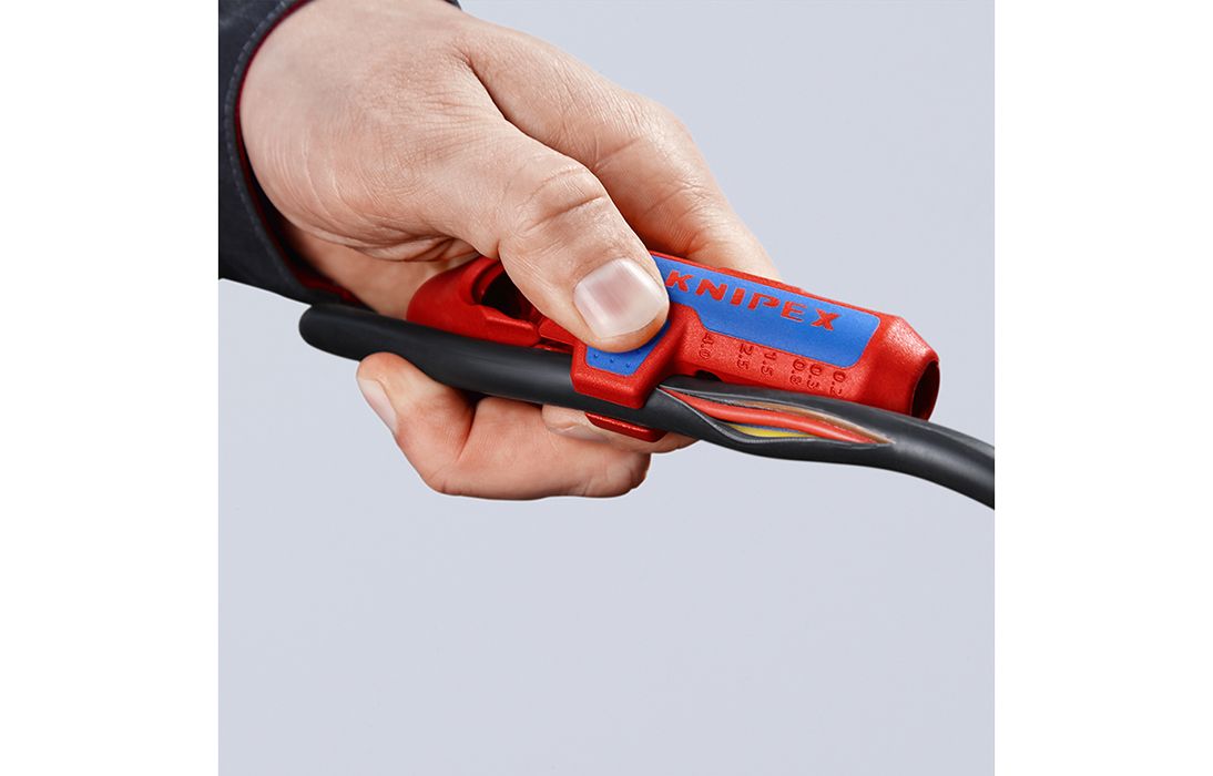 16 95 02 SB KNIPEX ErgoStrip® Для быстрого и точного удаления изоляции с наиболее часто применяемых круглых проводов и проводов для сырых помещений (например, NYM от 3 x 1,5 мм² до 5 x 2,5 мм²), дата-кабеля (витой пары) и коаксиального кабеля. Инновационный, эргономичный дизайн ручки пистолетной формы для лёгкого снятия и продольного реза изоляции. Оформленный конусом край инструмента для лучшего доступа к проводам в узком пространстве. Возможность удаления изоляции сечений 0,2 / 0,3 / 0,8 / 1,5 / 2,5 / 4 мм². Легкий ввод провода для удаления изоляции благодаря направляющим буртикам. С раскрывающей пружиной и замком. Удобная укладка коаксиального и дата-кабеля благодаря конструкции инструмента. Многокомпонентные рукоятки с зоной из мягкого пластика для удобной работы и надежного хвата. Для левшей.