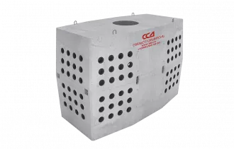 Комбинированный колодец имеет в сечении прямоугольную форму и состоит из двух элементов – корпуса с установленными в стенки спиральными муфтами и усиленной плиты перекрытия с круглым отверстием диаметром 600 мм для формирования горловины с люком. В центре основания корпуса колодца расположена прямоугольная ниша. При необходимости ее стенку вырезают для создания дренажа. Элементы колодца имеют строповочные петли для осуществления погрузо-разгрузочных работ, а также для установки их в котлован.